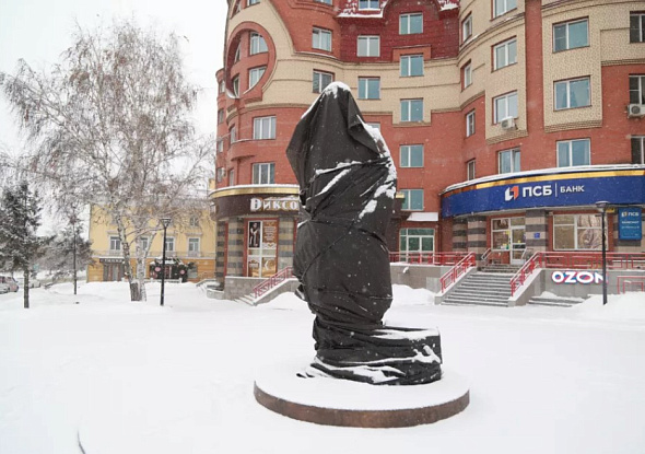 Под черной тканью угадываются очертания фигуры писателя и дорожного саквояжа у его ног. О дате открытия пока не сообщалось