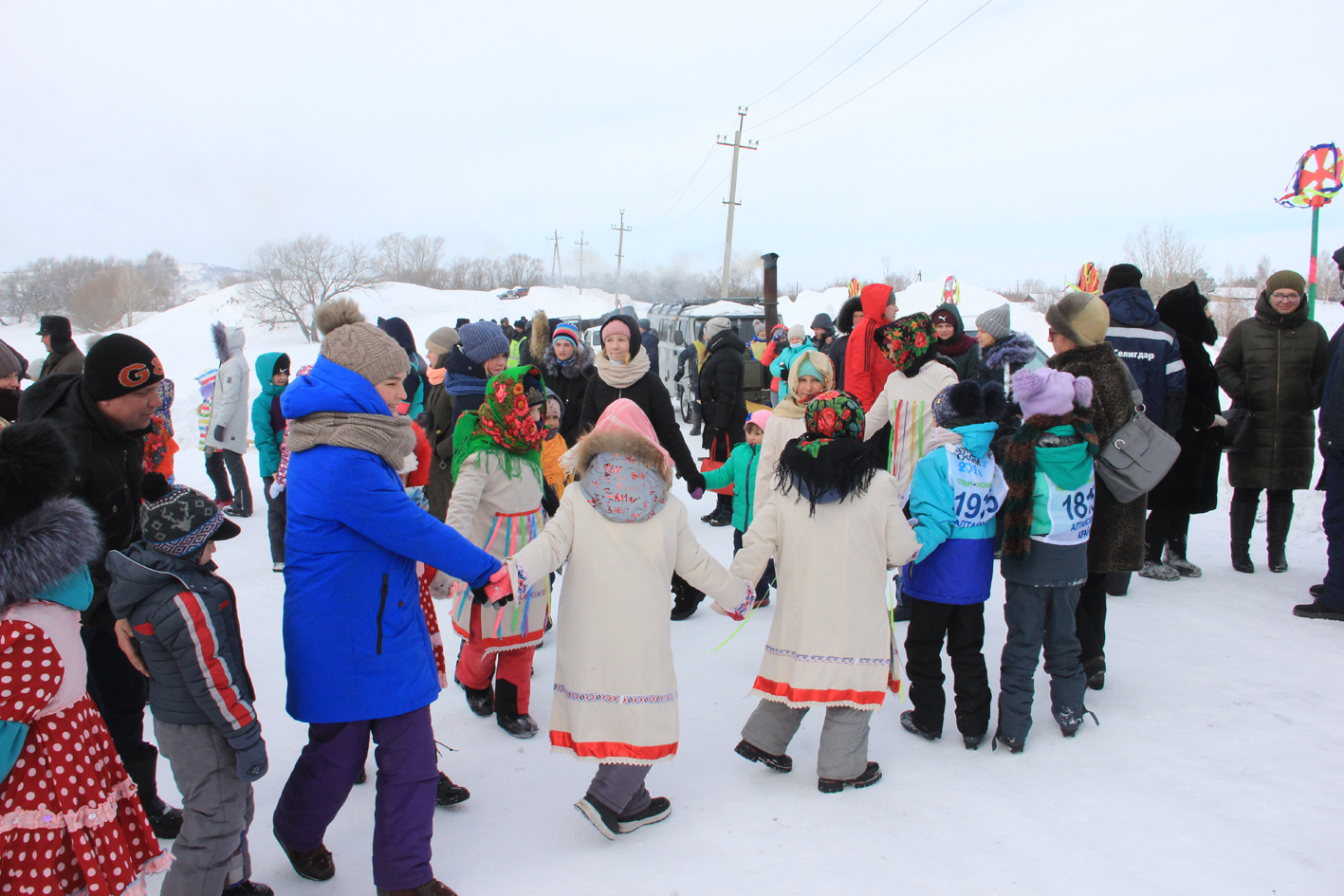 Пока ведущие пытались «согреть» теплыми словами, песнями и многочисленными веселыми конкурсами собравшихся, ребятишки с интересом участвовали в разных веселых конкурсах на площадках игрового городка – прыгали через скакалку, метали киянку и деревянные брусочки в цель, ходили на ходулях и импровизированных лыжах, перетягивали канат. Порой в «детских» конкурсах можно было встретить и взрослых, что делало праздник только веселее. Самые успешные получали призы – баранки на веревочке, выглядевшие как спортивные медали, отчего все смотрелись словно победители Олимпиады во время награждения. Самыми успешными были признаны три участницы - Оксана Ровенская, Алина Баранова и… Настя Кудрявцева!
