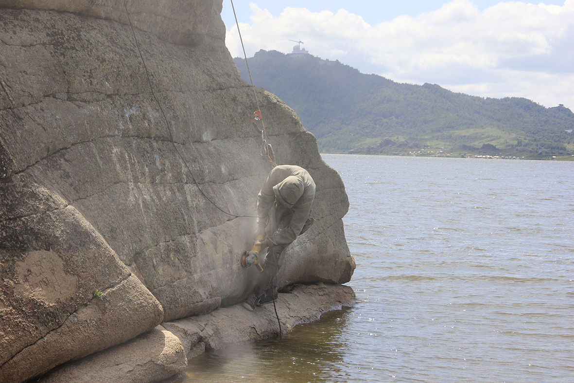 На Колыванском озере чистят скалы от надписей вандалов