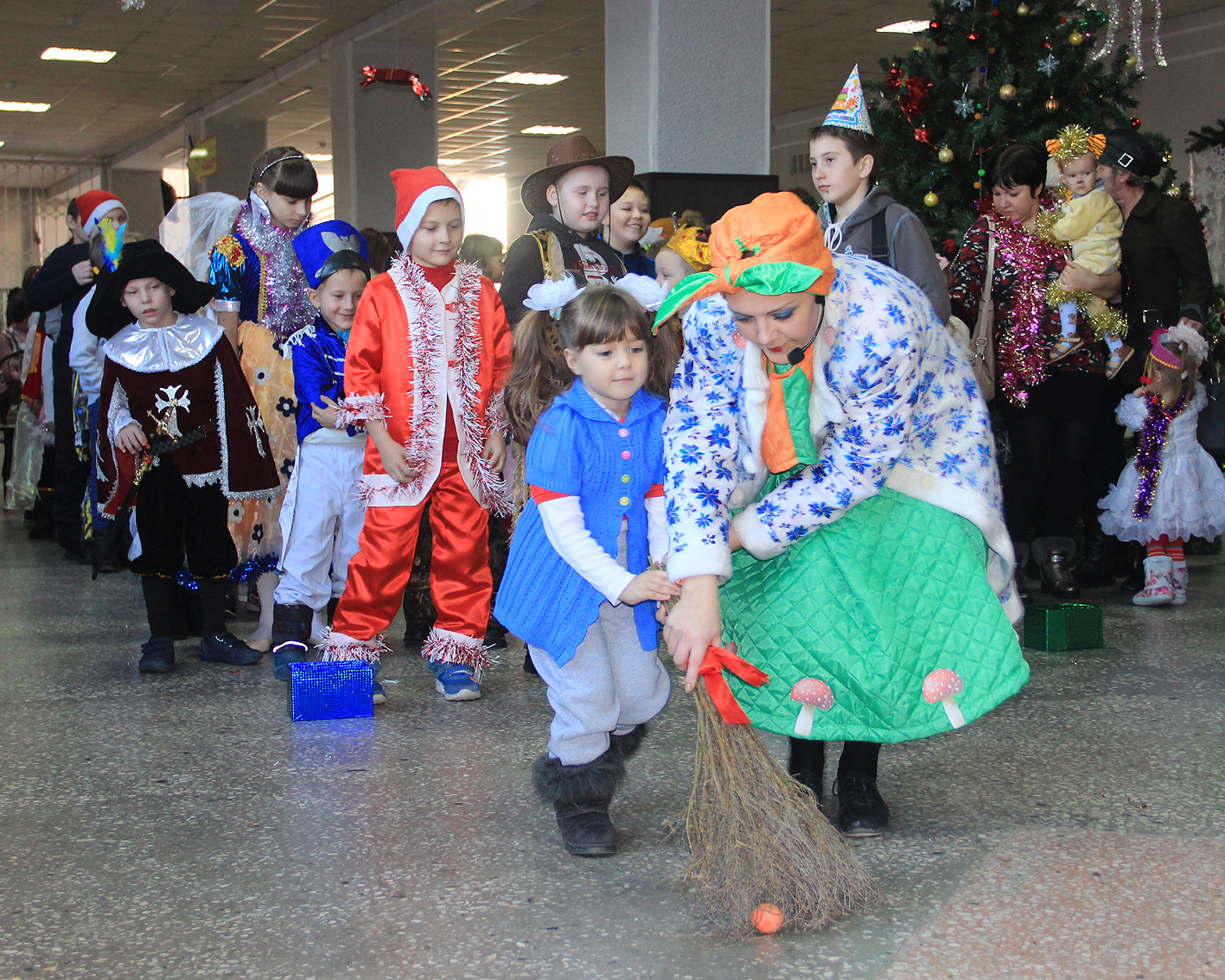 Все маленькие гости пришли на представление с родителями. Наряды на них – просто загляденье! Есть тут принцы и принцессы, лисы и лисички, гусары, мушкетеры, даже дракон прилетел, на сказочный бал.