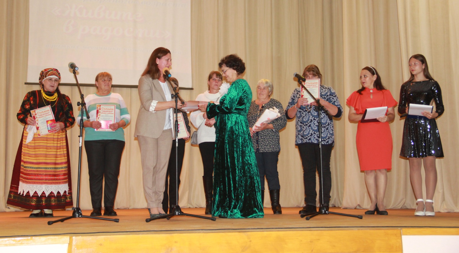 Коллектив-юбиляр нынешнего года (вокальная группа "Родные напевы", руководитель Юлия Матяжова, Карамышевский Дом культуры ) поздравила председатель Союза ветеранов культуры Змеиногорского района Галина Валентиновна Смирнова.