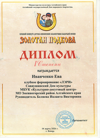 Яркое выступление Евы Иванченко не оставило равнодушным ни зрителей, ни членов жюри. Аплодисменты и овации звучали после каждого конкурсного номера этой звонкоголосой саввушинской солистки. Жюри оценило по достоинству артистичную юную казачку наградив высокой наградой - дипломом I степени.