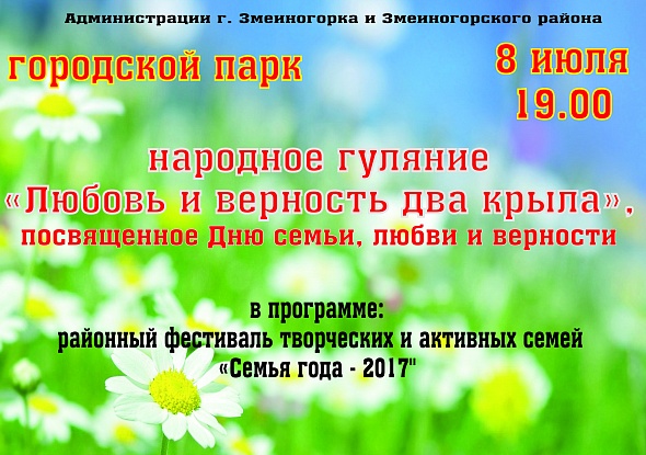 Напоминаем змеиногорцам и гостям города: сегодня, в честь праздника семьи, любви и верности, в парке пройдут интересные мероприятия. Приходите туда в 19 часов, не пожалеете!