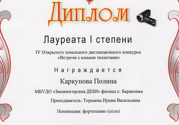 C 1 апреля по 16 мая в г.Рубцовске проходил IV Открый зональный дистанционный конкурс «Встречи с юными талантами – 2017» в котором приняли участие обучающиеся ЗДШИ филиала с. Барановка.