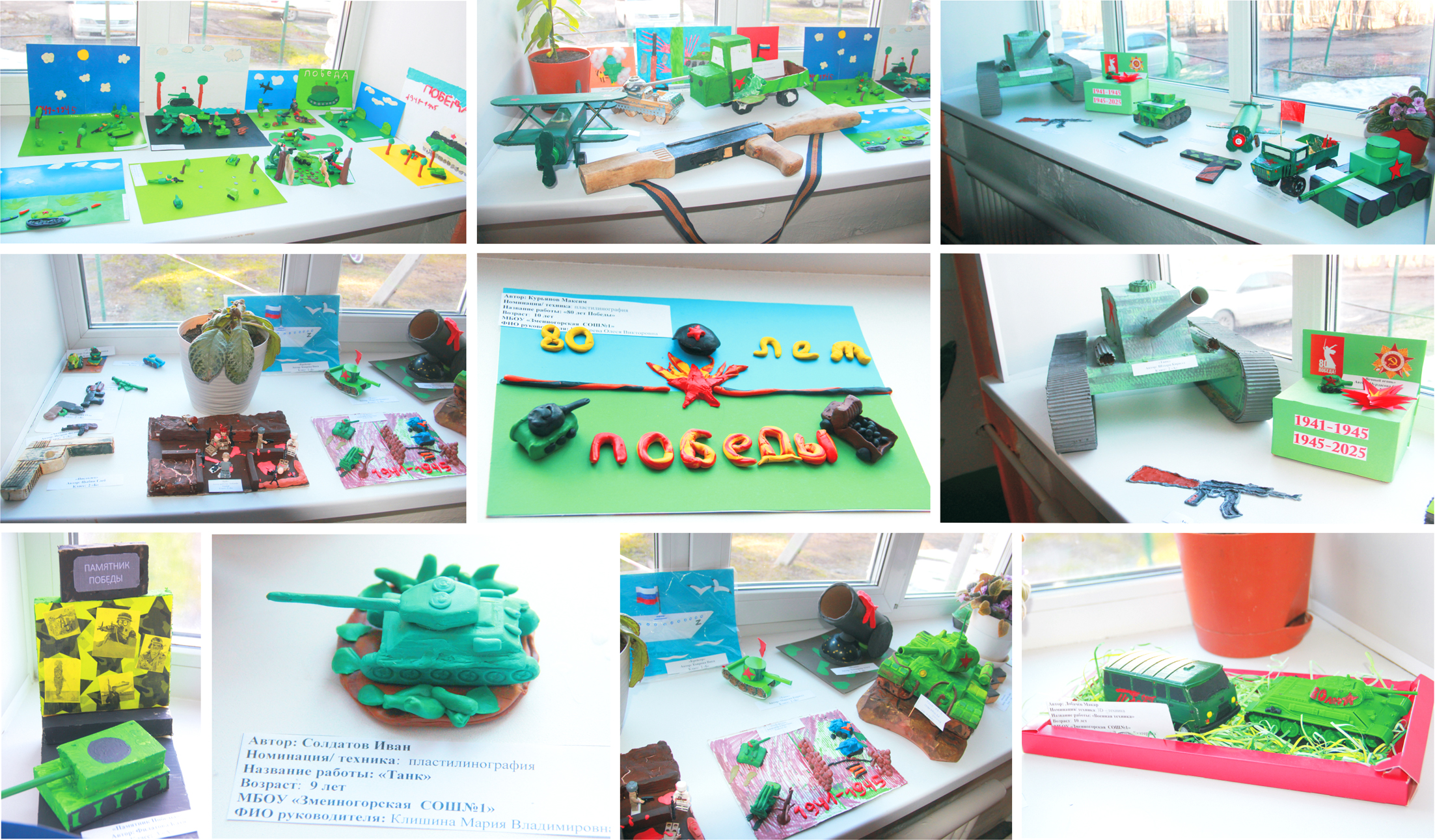 В рамках этого фестиваля, объявленного в Змеиногорском муниципальном округе, в школе № 1 города Змеиногорска открыта вот такая выставка!Смотрите, это своего рода, воркшоп (мастерская), «Символы Победы», в которой отлично поработали и дети, и взрослые. Здесь создали многочисленную военную атрибутику - флаги, эмблемы, символику, оружие из бумаги, папье-маше, пластилина. Как нам рассказала Наталья Николаевна Королева, заместитель директора по воспитательной работе школы, большую часть макетов изготовили ребятишки начальной школы, но есть на выставке и работы шестиклассников. Сами захотели принять участие, интересно стало.