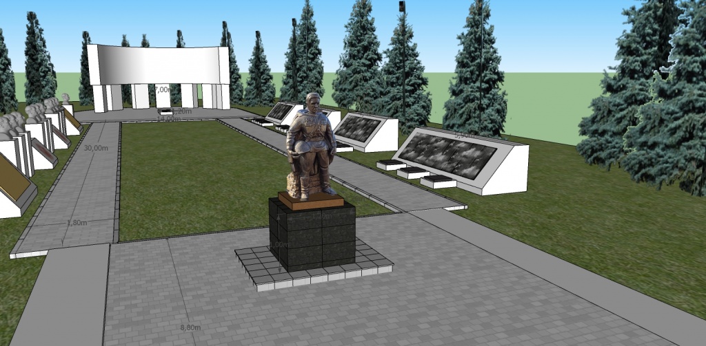 Для наглядности прикладываем проект мемориального комплекса и фото памятника солдату для установки. Памятник 1 м. 90 см (прочный армированный бетон, пропитанный гидрофобным раствором). Размер постамента на котором он будет располагаться 2 м.