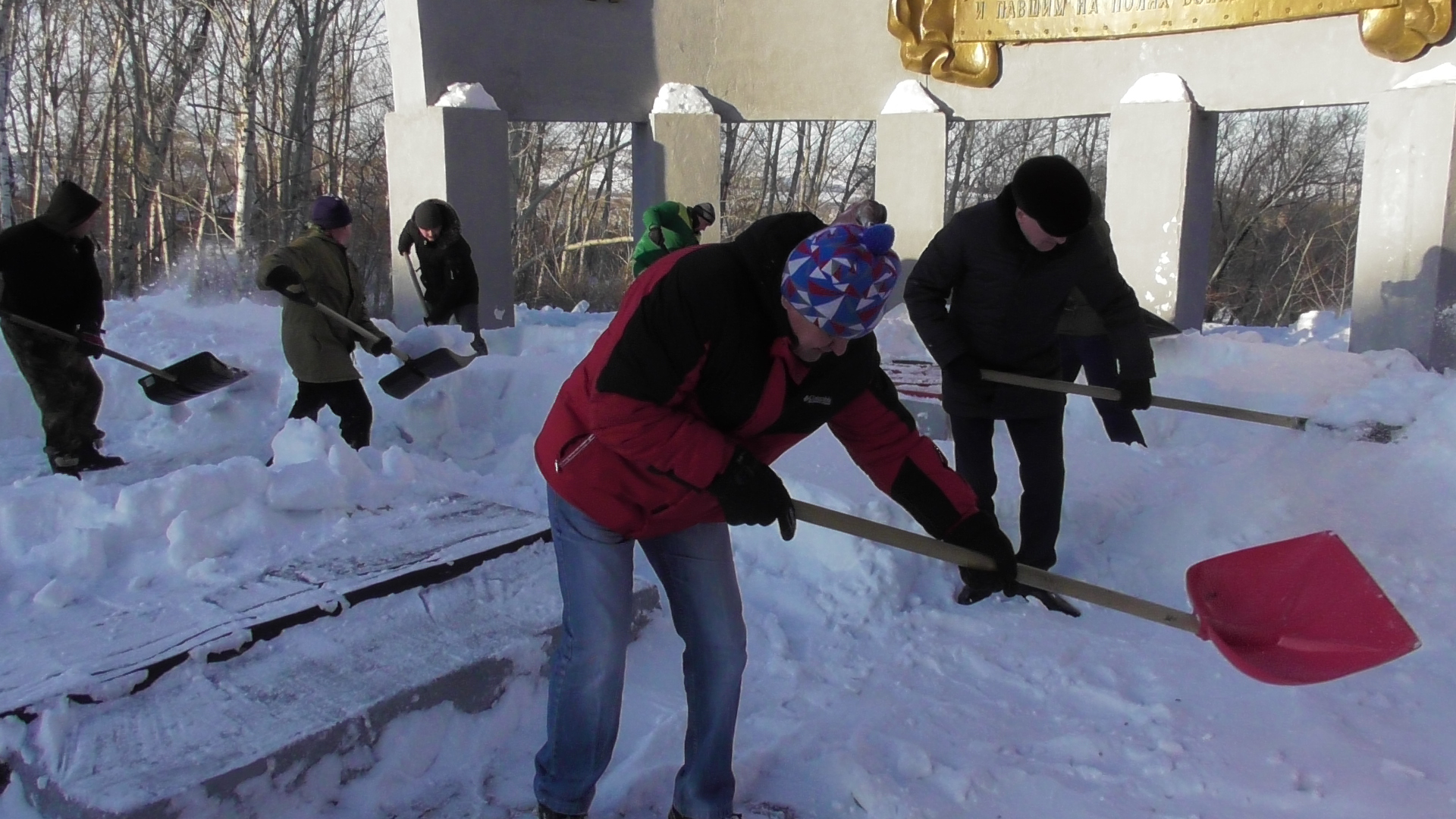На работу по очистке мемориального комплекса от снега вышли сотрудники администраций города и района, работники бюджетных учреждений (образования, культуры и другие).