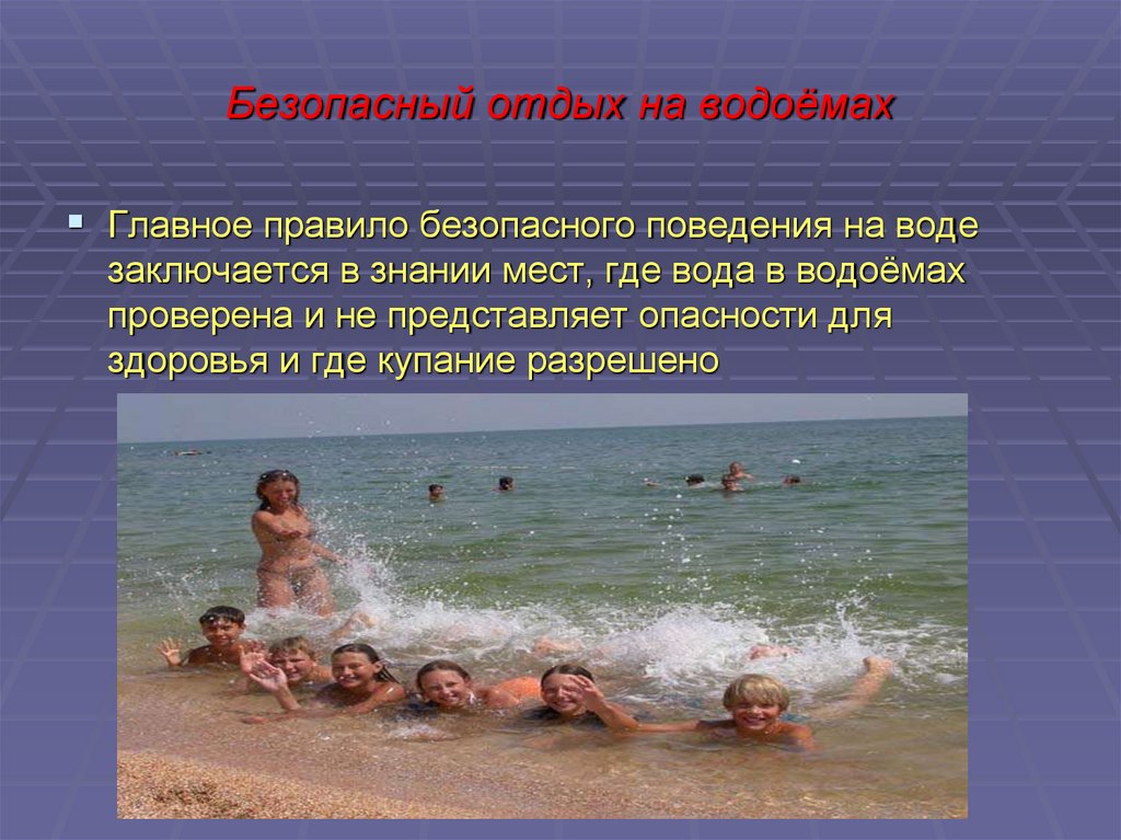 * Если нет поблизости оборудованного пляжа, надо выбрать безопасное место для купания с твёрдым песчаным, не засоренным дном, постепенным уклоном.