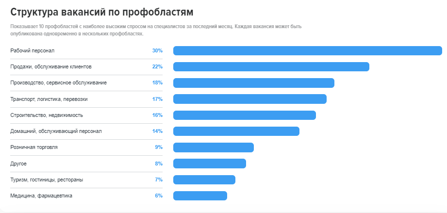 Всего в июне в Алтайском крае было открыто 16 тыс. вакансий. Чаще всего это были предложения для специалистов из профессиональных сфер «Рабочий персонал» (30%), «Продажи, обслуживание клиентов» (22%), «Производство, сервисное обслуживание» (18%), «Транспорт, логистика, перевозки» (17%) и «Строительство, недвижимость» (16%).