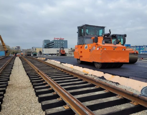 В то же время частично уже заасфальтирован участок на сопряжении путепроводов и подъезд со стороны улицы Кулагина, где уже уложены рельсы. Теперь их укладывают по проспекту Ленина в сторону Дома Быта. В скором времени участок трамвайного пути от Дома Быта до улицы Кулагина будет полностью готов.