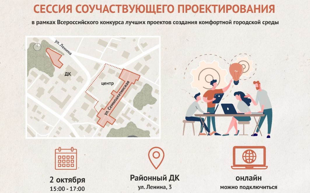 Для того, чтобы учесть все ваши предложения при разработке проекта, приглашаем вас высказать свое мнение на проектном семинаре, который состоится 2 октября 2023 года в 15:00, место проведения - Районный ДК (по адресу ул. Ленина, 3).