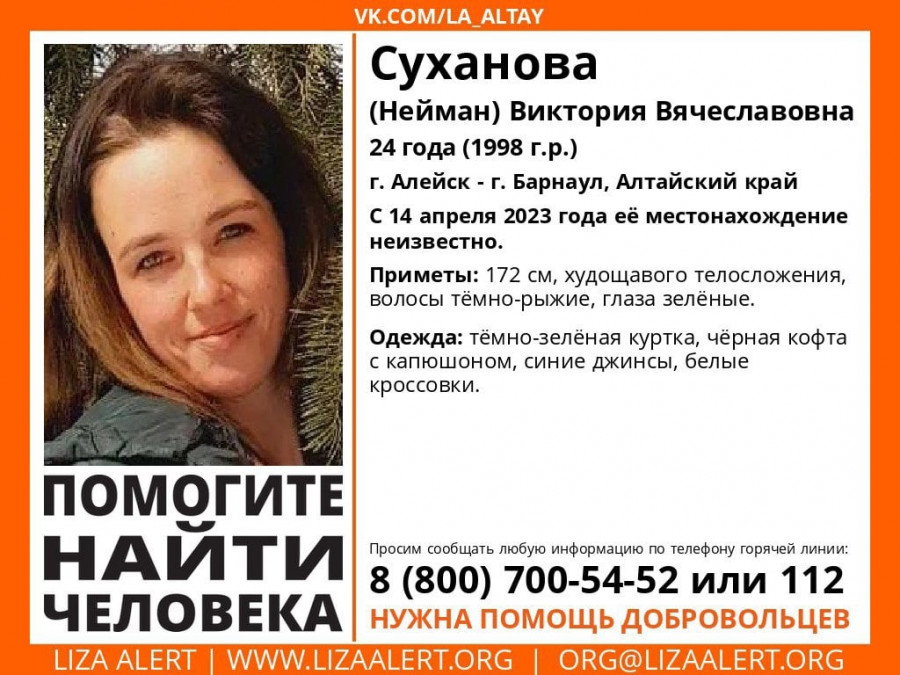 В Алтайском крае пропала 24-летняя девушка. Об этом сообщает поисковый отряд «ЛизаАлерт».Виктория Суханова (Нейман) пропала 14 апреля. Об ее местонахождении неизвестно. Предположительно, девушка может находится в Алейске или в Барнауле.
