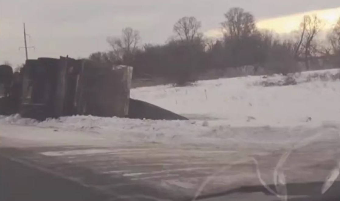 Авария произошла утром в четверг, 25 декабря. Очевидцы запечатлели завалившийся на бок прицеп, из которого высыпалось содержимое. Тягача рядом не видно.