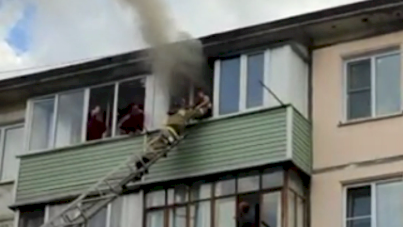 При помощи автолестницы пожарные спасли из горящей квартиры ребёнка. Он находился один.