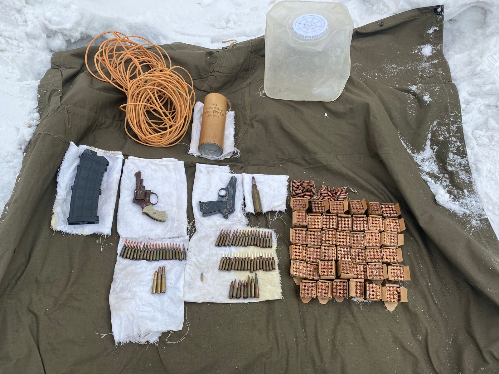 По поступившей оперативной информации, тайник находился на открытой местности вблизи заброшенного хозяйственного корпуса на территории Бийска. В результате проверки данных оперативниками и взрывотехниками обнаружены и изъяты из незаконного оборота пистолет «Вальтер», пистолет револьверного типа, магазин к охотничьему ружью, детонирующий шнур ДШВ длиной 25 метров, имитационный патрон ИПМ-100 и свыше 760 патронов различного калибра.