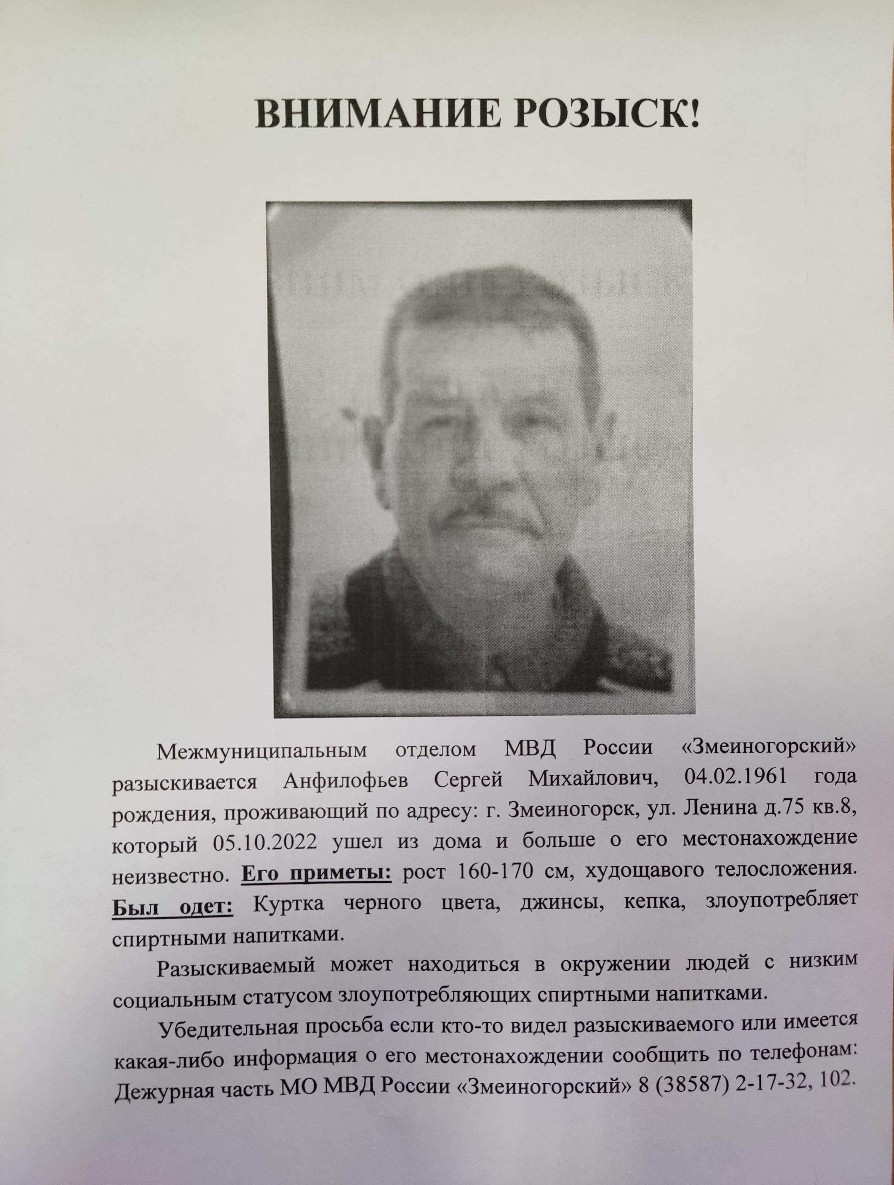 МО МВД России "Змеиногорский" разыскивается Анфилофьев Сергей Михайлович.Который 5.10.2022 г. ушел из дома и больше о его местонахождении ничего не известно.