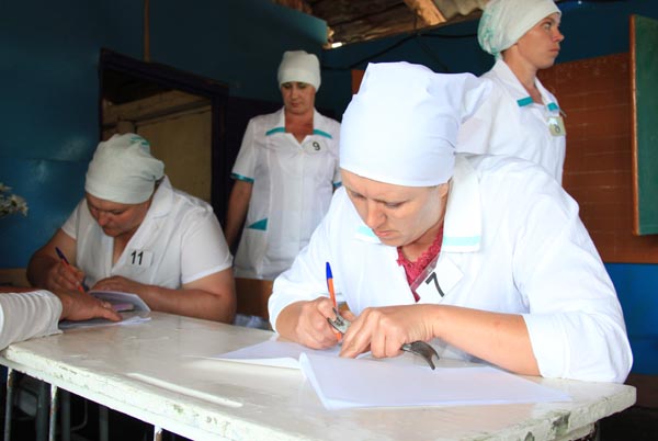 Получив всю необходимую информацию, конкурсантки в белых халатах отправились выполнять задания. Одно из заданий - проверка теоретических знаний, где в виде теста необходимо было ответить на 25 вопросов. В другом задании оценивалось умение собирать и разбирать доильный аппарат. Нужно было за наименьший отрезок времени правильно выполнить всю работу, при этом рассказывая обо всех нюансах. После этого конкурсантки показывали свою технику быстрого и правильного доения, а после шли на этап санитарной подготовки, где проверялось качество молока.