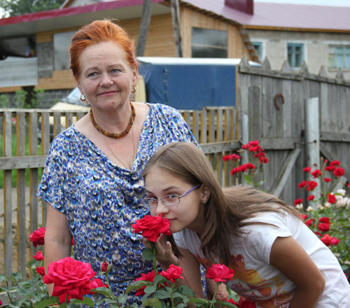 У Нины Николаевны Медведевой на приусадебном участке 48 кустов роз, причем выращивает она их сама - черенками. Глаз радуют пионы, сентябринки, многолетняя рудбекия. Помогает Нине Николаевне ухаживать за цветами ее внучка Сашенька, которая на лето приезжает к бабушке из Новосибирска.