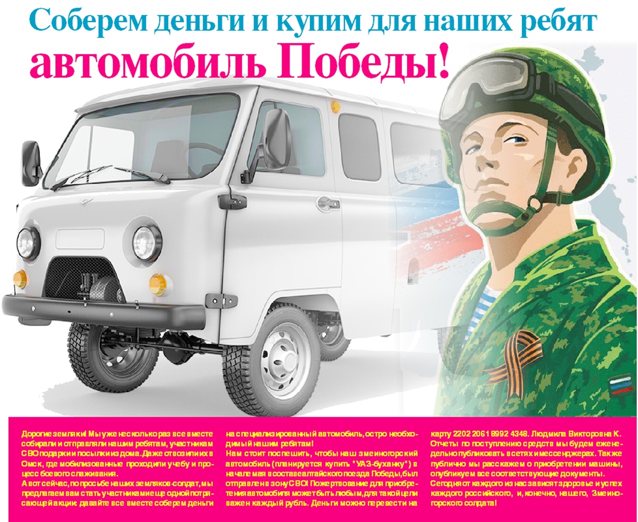 Спешите, акция продлится до 15 апреля. Пожертвование для приобретения автомобиля может быть любым, для такой цели важен каждый рубль. Деньги можно перевести на карту 2202 2061 8992 4348 Людмила Викторовна К.