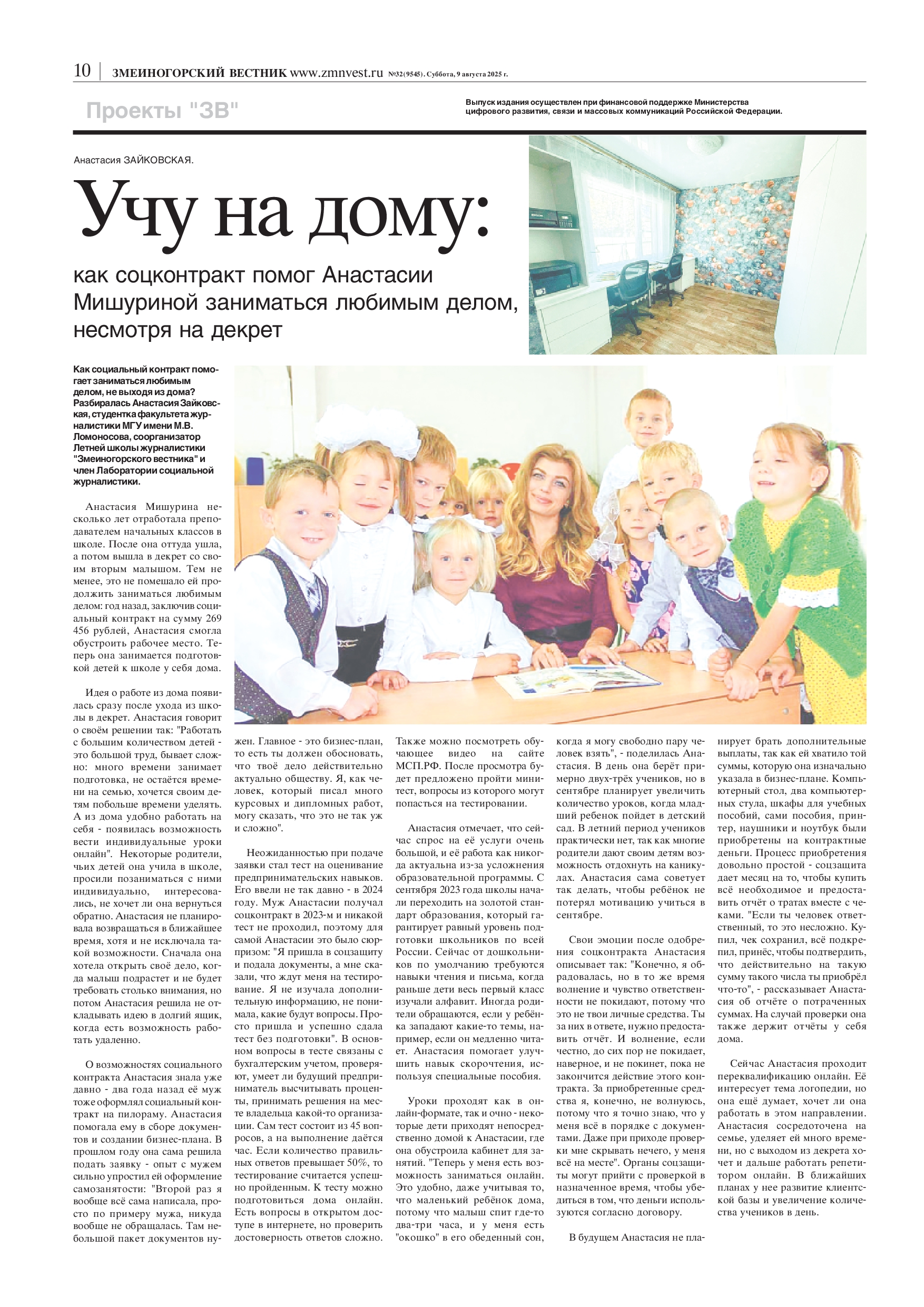 Каждой молодой маме непросто совмещать работу и материнство.А вот Анастасии Мишуриной в этом помог соц.контракт. Она стала обучать детей на дому. Впрочем, все подробности в нашей газете!