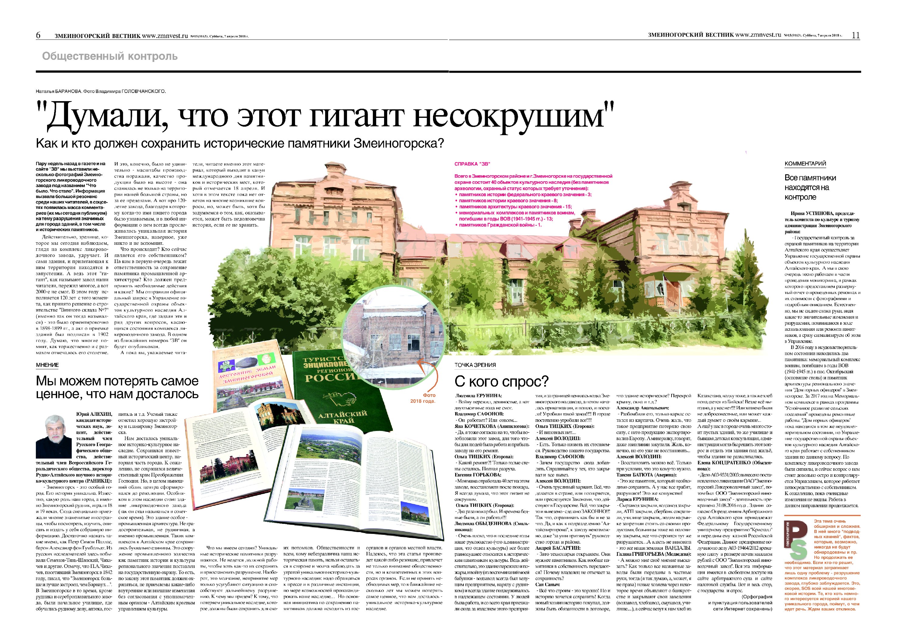 Эта тема номера, в рамках проекта "Общественный контроль", подготовлена по вашим предложениям, дорогие читатели.Мы не ставим точку при обсуждении судьбы здания Змеиногорского ликеро-водочного завода. Ждем ваших откликов и предложений по сохранению памятников истории и культуры в городе Змеиногорске.
