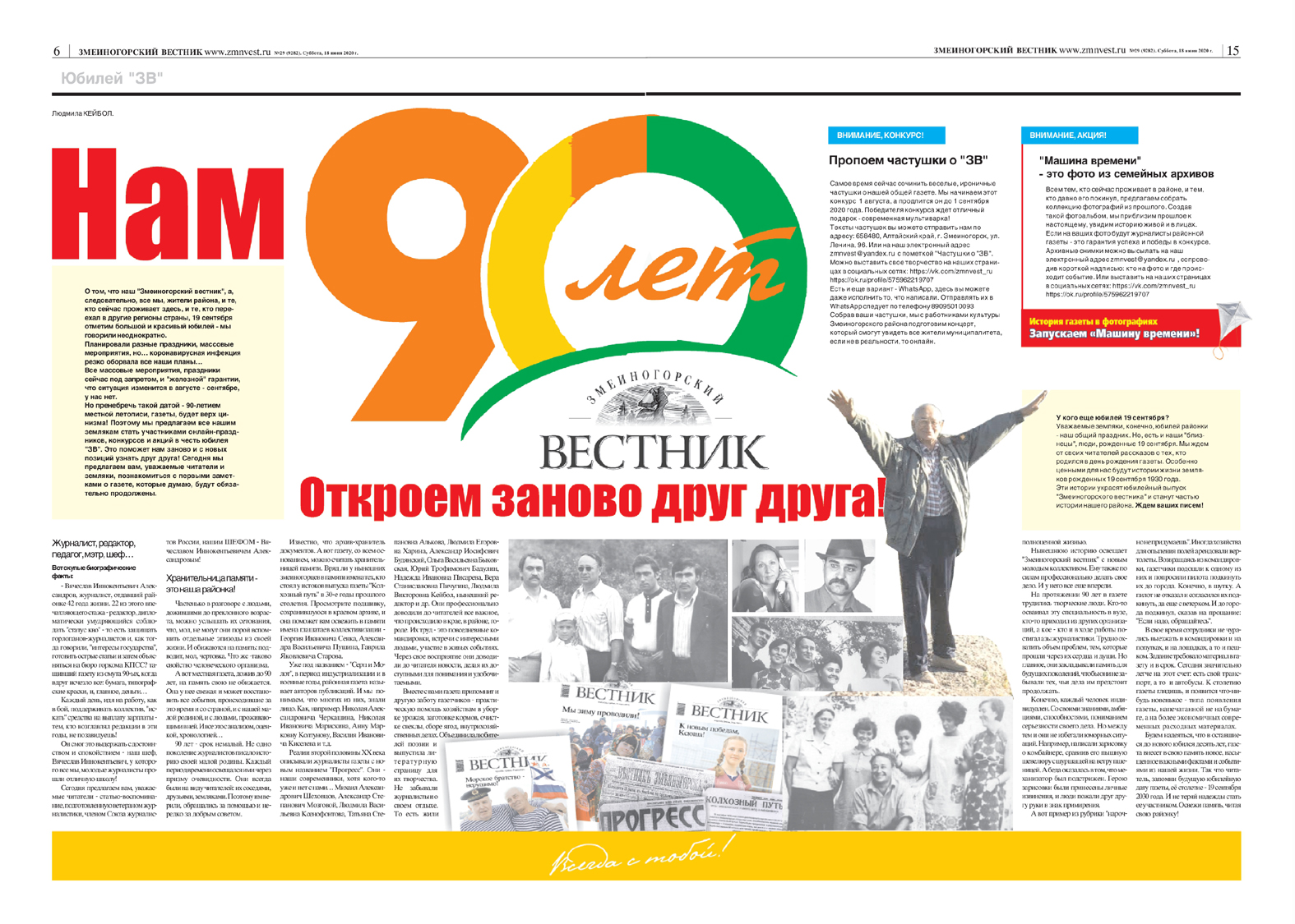 19 сентября мы вместе с вами, уважаемые земляки и читатели, отметим 90-летний юбилей "Змеиногорского вестника"!У нашей районки были разные имена, ее выпускали разные люди... Но она, газета, всегда была верна своим читателям и защищала их интересы.