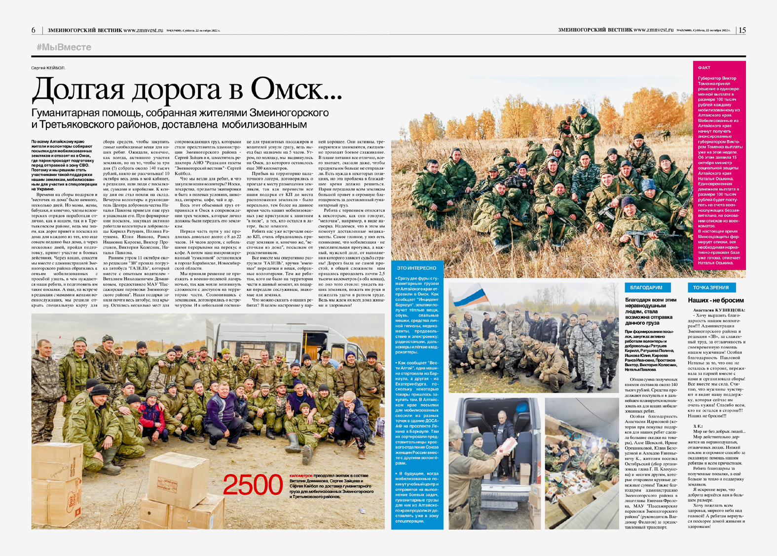 Эта тема номера в новом выпуске "ЗВ" посвящена нашей поездки в Омск, к мобилизованным из Змеиногорского и Третьяковского района.Как видите на фото - все наши ребята здоровы, бодры и энергичны. Подробности читайте в газете!