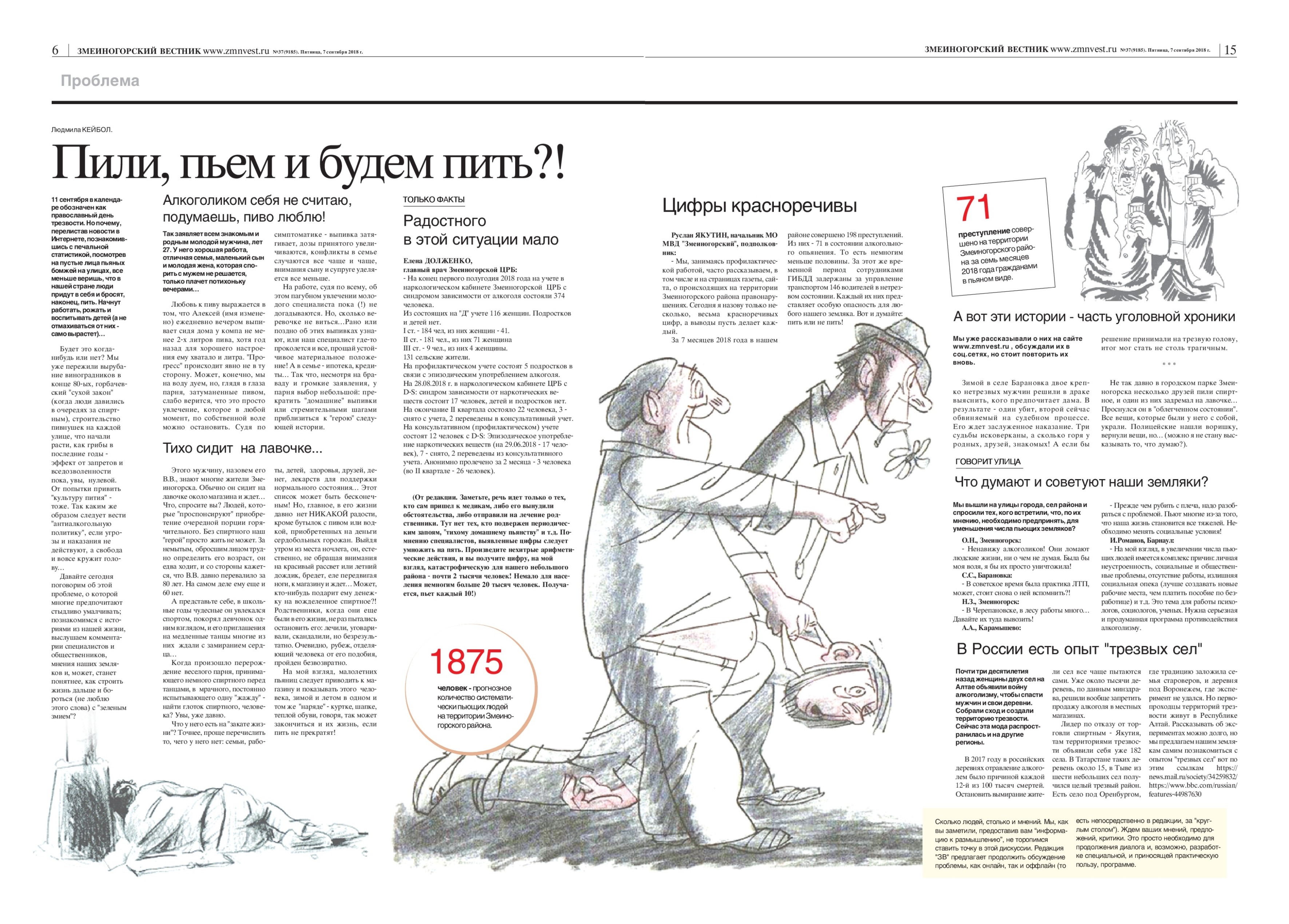 Журналисты "ЗВ" в новом выпуске газеты поднимают "вечную проблему".Эта тема номера в издании касается многих наших земляков. Будем рады вашим откликам и предложениям.Нам не стоит надеяться, что какие-то добрые "дяденьки и тетеньки" решат проблему алкоголизации общества. Давайте САМИ предложим пути решения.