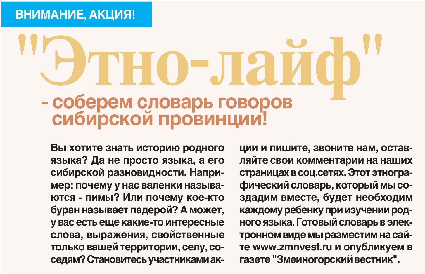 Приглашаем всех наших читателей и друзей стать участниками новой акции "ЗВ".Эта акция объявлена в рамках социально значимого проекта "Вестника" "Энциклопедия народного творчества Алтайской провинции".