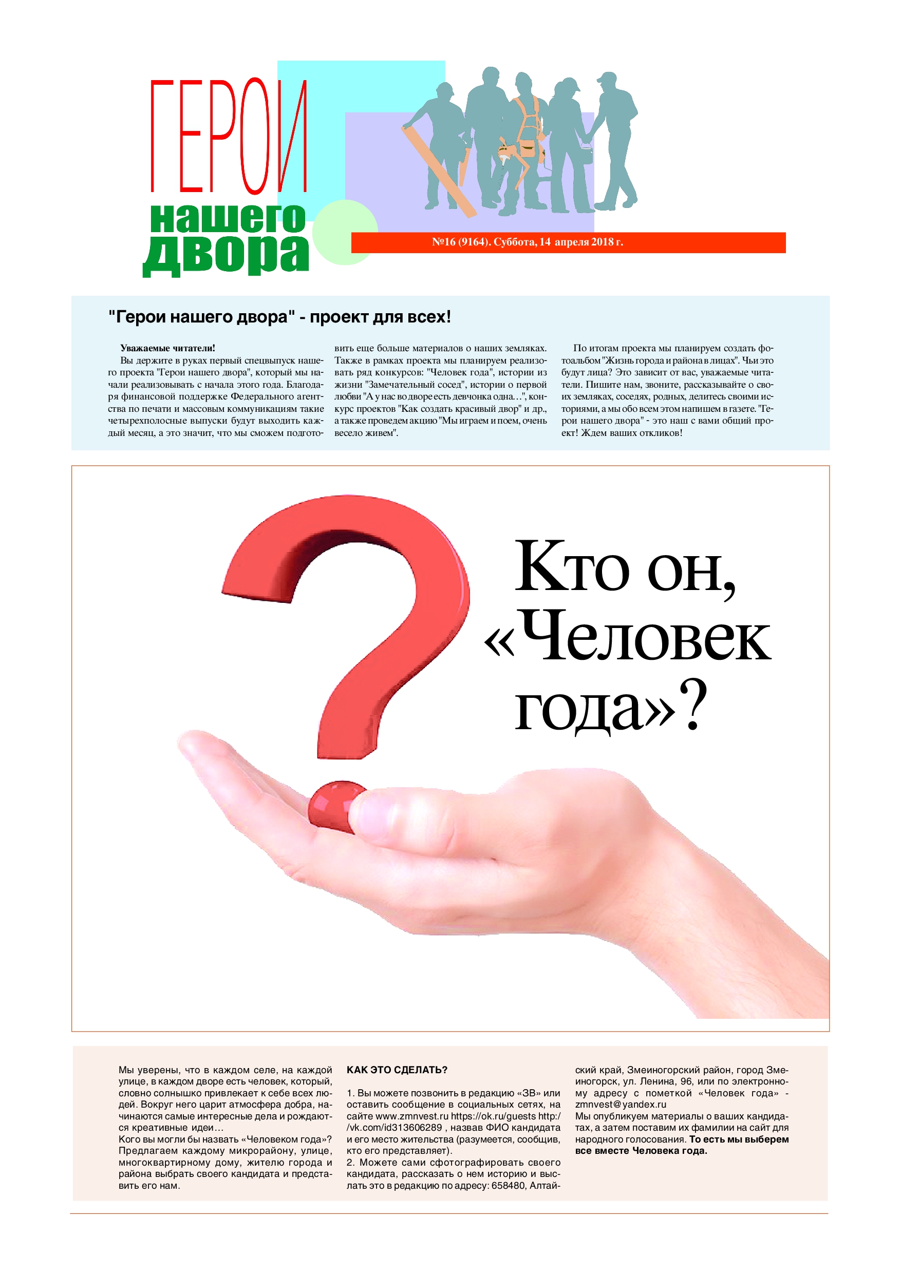 На следующей неделе каждый подписчик и читатель газеты «Змеиногорский вестник» получит специальную вкладку «Герои нашего двора» в рамках реализации одноименного социально значимого проекта.Если вы еще не подписаны на наше издание, поторопитесь сделать это – ведь наших читателей и подписчиков ждет много приятных сюрпризов!