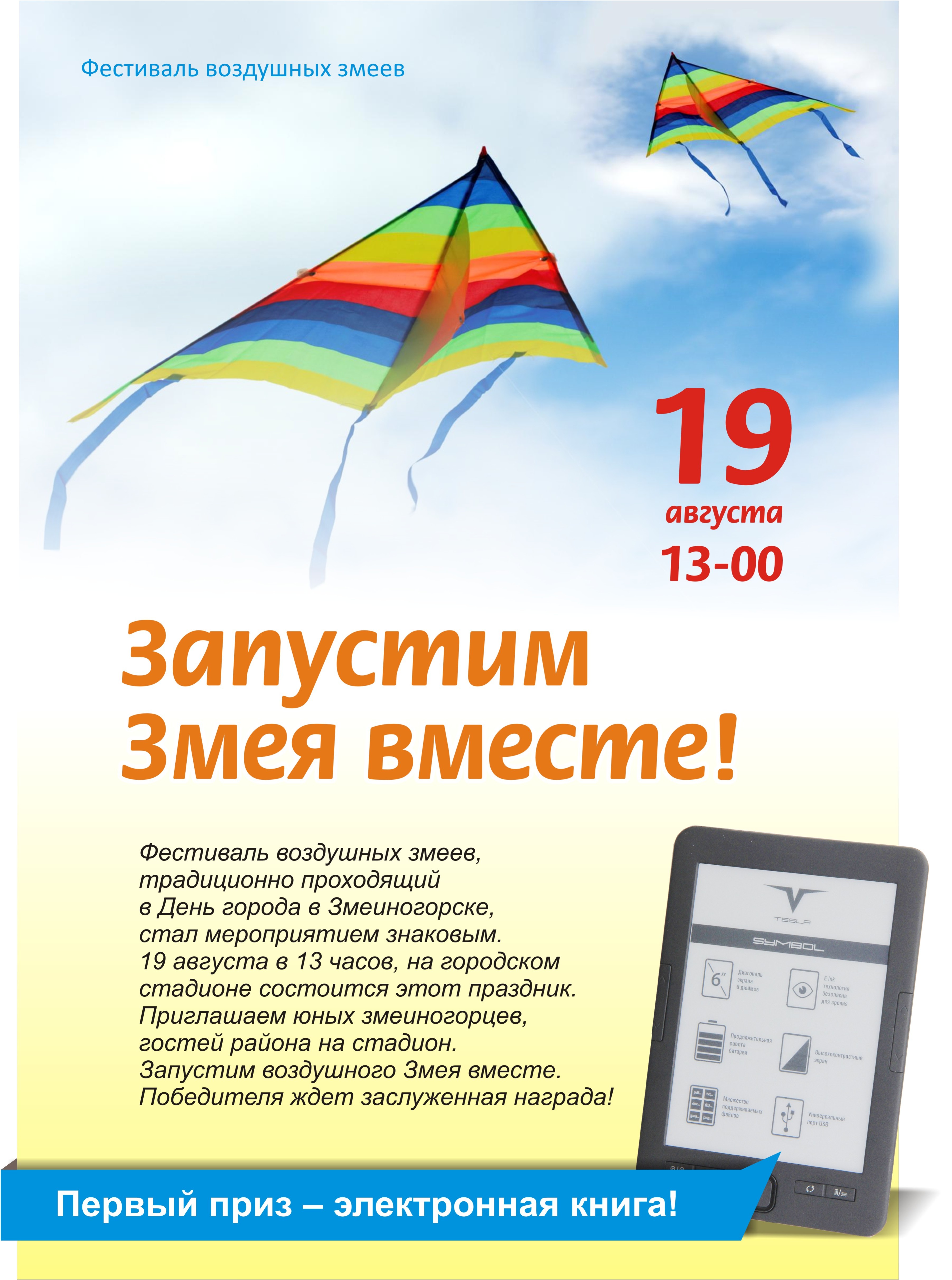 Напоминаем всем жителям Змеиногорского района и нашим гостям, что 19 августа пройдет Фестиваль воздушных Змеев!Готовьте своего"героя" и приходите на городской стадион, 19 августа в 13 часов! Вас ждут призы и подарки!