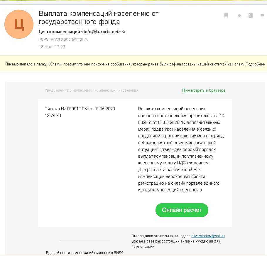 Смотрю: автор письма Единый центр компенсаций населению ВНДС. ВНДС звучит гордо прямо как ВДНХ, только ВНДС и расшифровывается возврата налога на добавленную стоимость. Разумеется, никогда такого центра в России не существовало. Смотрю дальше: адрес электронной почты: info@kurorta.net
