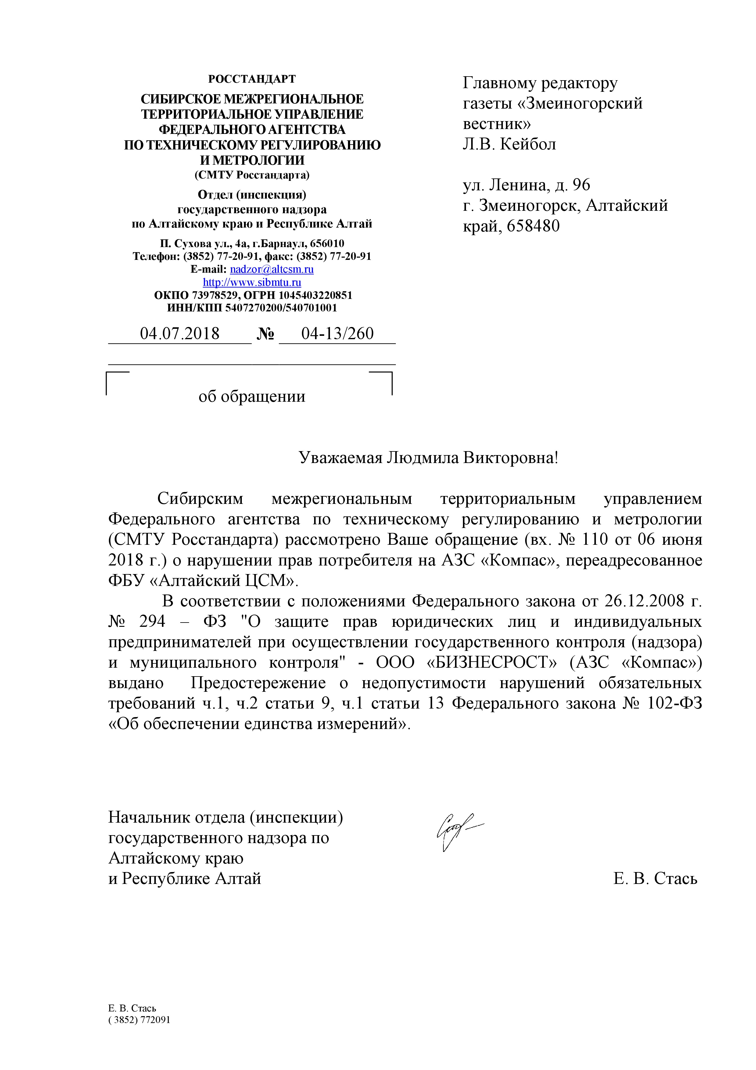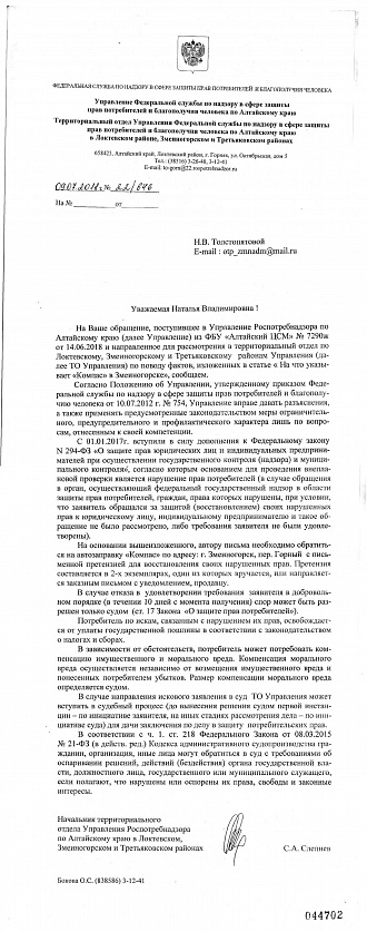 Некоторое время назад мы публиковали письмо жителя Змеиногорска В.Рубцова, о проблемах, возникших у него при обращении на АЗС «Компас».Мы обратились в соответствующие контролирующие структуры и получили от них ответы, которые появятся в очередном выпуске «Общественный контроль» в газете «Змеиногорский вестник».