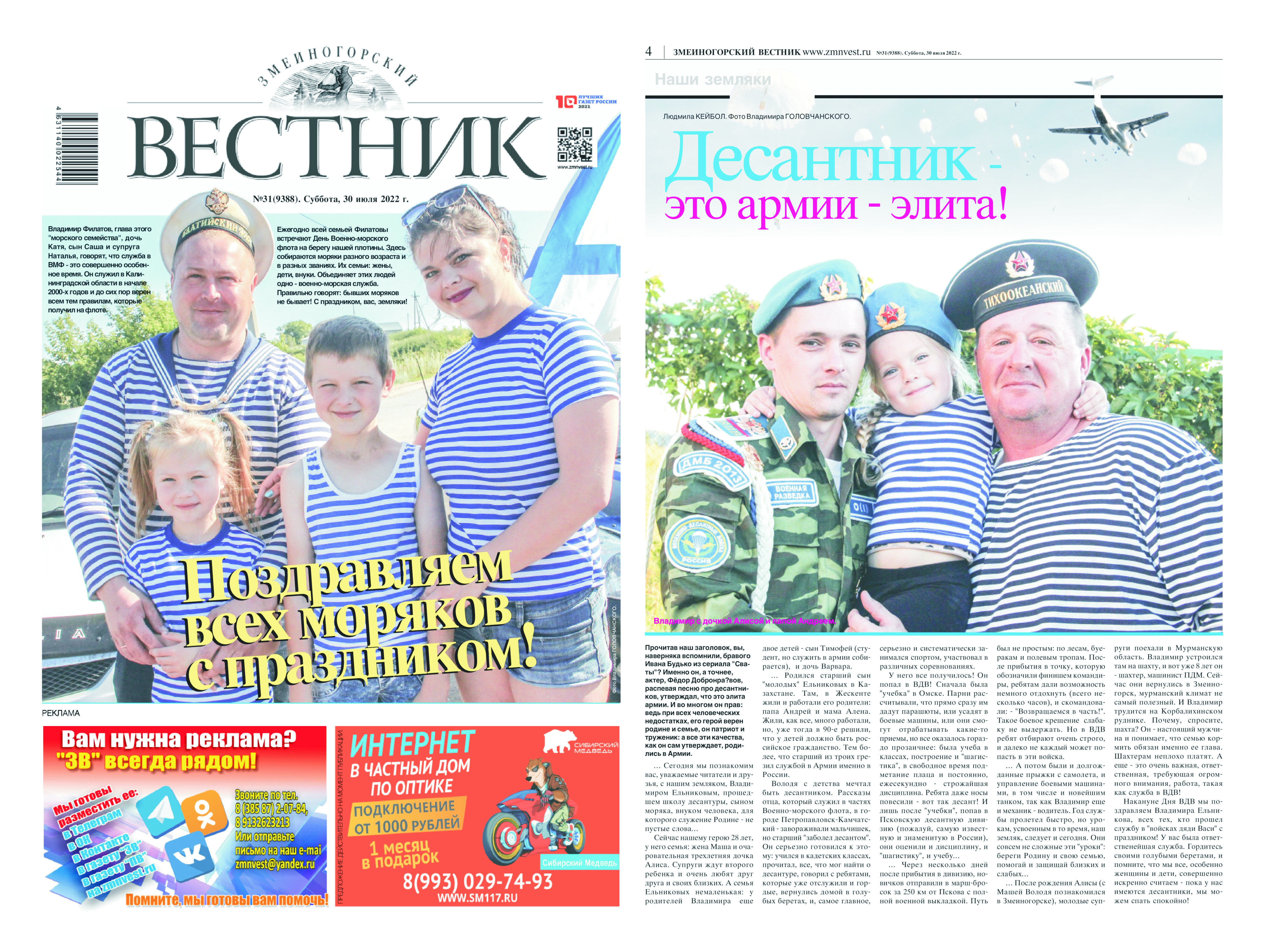 В новом номере "Змеиногорского вестника" наших читателей ждет немало приятных сюрпризов.Мы поздравляем моряков с наступающим днем ВМФ. Рассказываем, в предверье Дня ВДВ о нашем земляке-десантнике. А еще для вас, уважаемые читатели подготовлен специальный выпуск "Энциклопедия народного творчества Алтайской провинции", где много интересного, и продолжение нашей акции "Этно-лайф". Читайте, и вы узнаете, что "зараза" - это совсем не бранное слово!