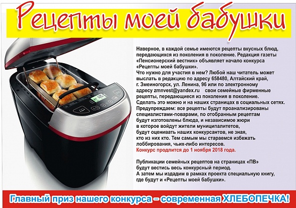 Напоминаем всем нашим землякам, читателям, что АНО "Редакция газеты "Змеиногорский вестник", в состав которой входит и газета "Пенсионерский вестник", проводит конкурс «Рецепты моей бабушки».Внимательно читайте условия конкурса и обязательно примите в нем участие. В качестве дополнительного шага к победе может стать интересная семейная история, связанная с тем или иным блюдом, которую вы расскажите нам и всем жителям края.