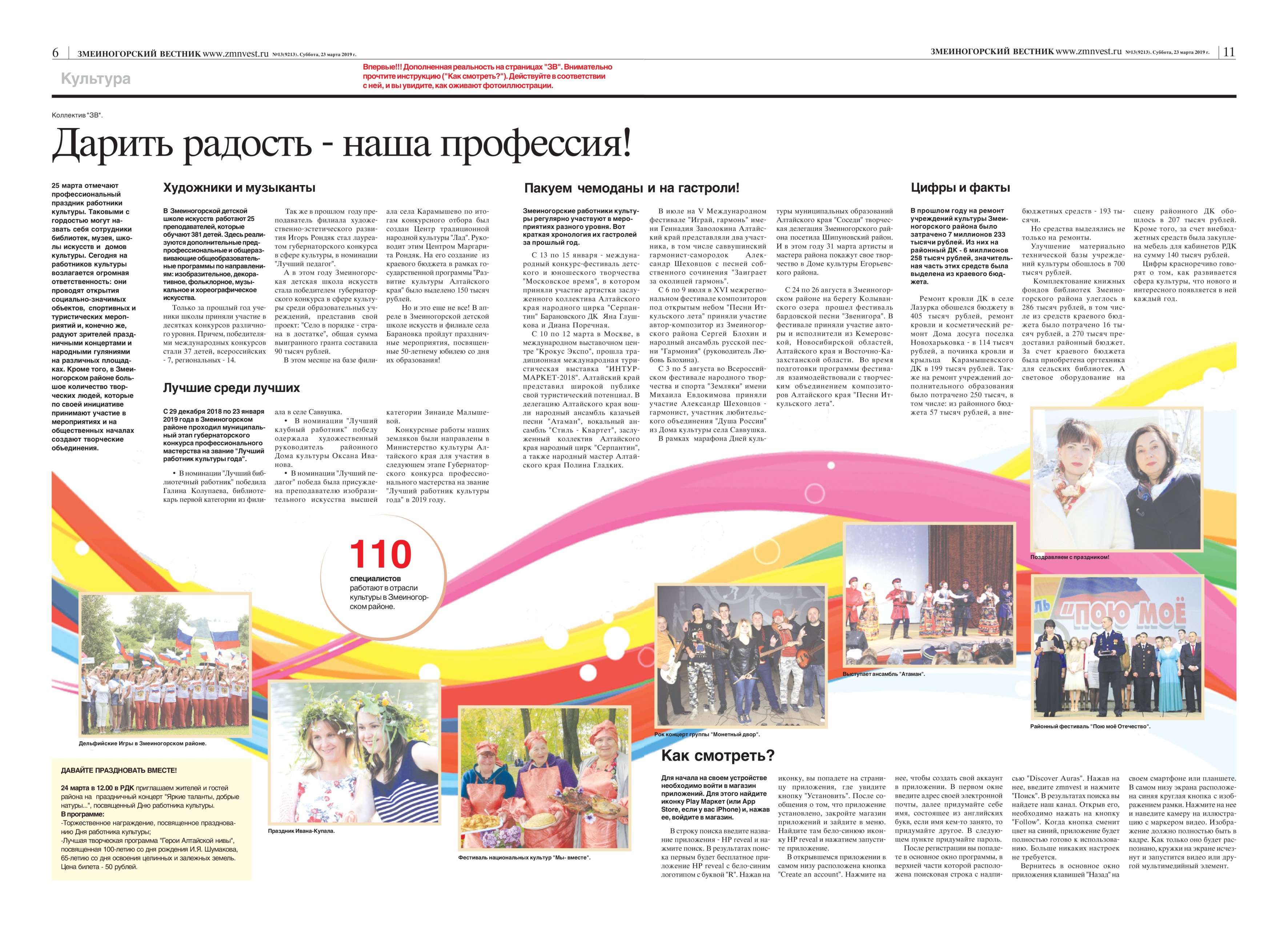 Вы мечтали о том, чтобы в бумажном варианте газеты, журнала можно было увидеть видео? В субботнем выпуске "Змеиногорского вестника" 23 марта у каждого нашего читателя и подписчика будет такая возможность!Каждая фотография в этой "теме номера" - оживает, стоит только поднести к ней свой телефон. Но, для начала вам предстоит выполнить несколько несложных действий.