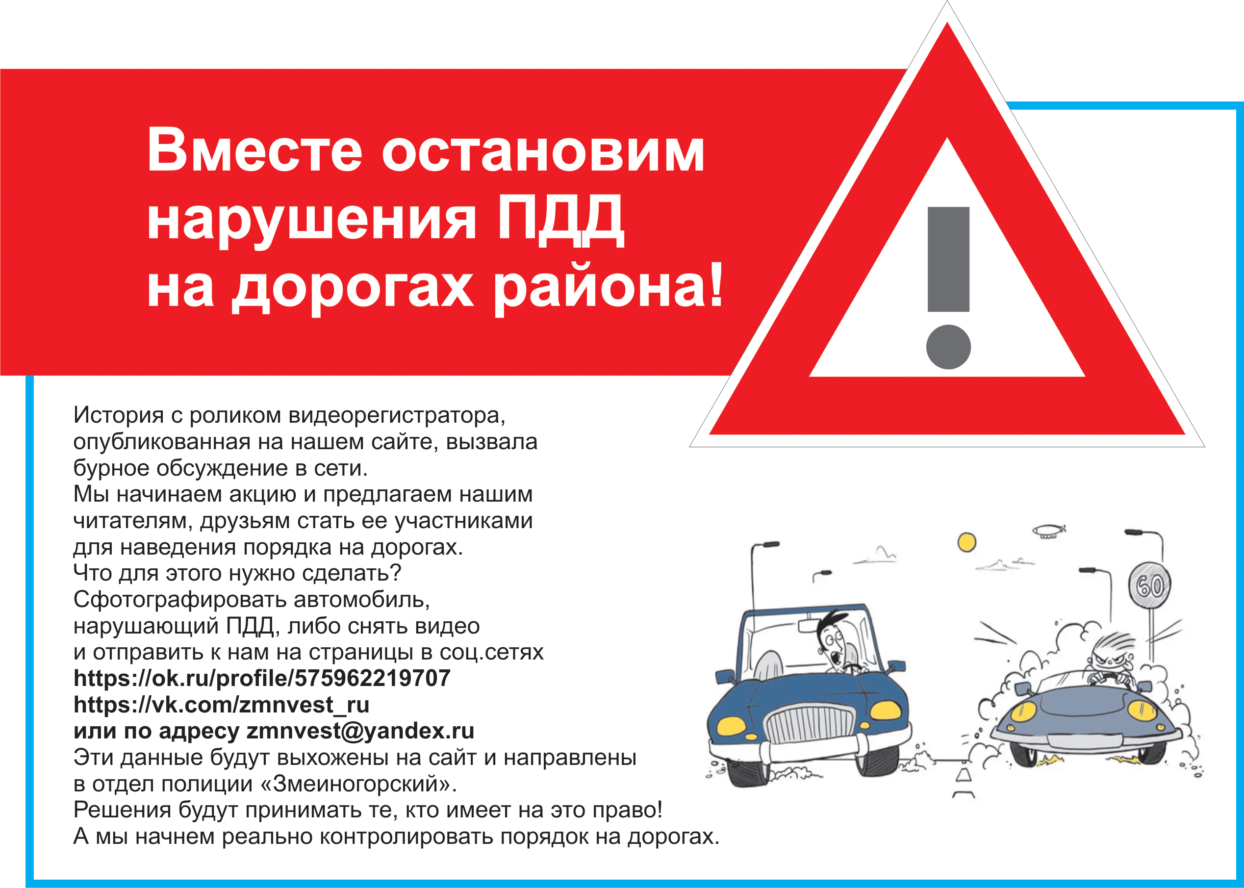 Эту акцию мы начинаем по согласованию с МО МВД "Змеиногорский". Судя по реакции читателей, обстановка на дорогах не самая спокойная, нарушений ПДД - хватает. Причем, как со стороны водителей, так и со стороны - пешеходов. Есть одна интересная поговорка: "Пешеход- всегда прав. Но не всегда жив!"Поэтому предлагаем вам, земляки высылать нам фото ВСЕХ нарушений ПДД, в том числе и пешеходами. Ждем!