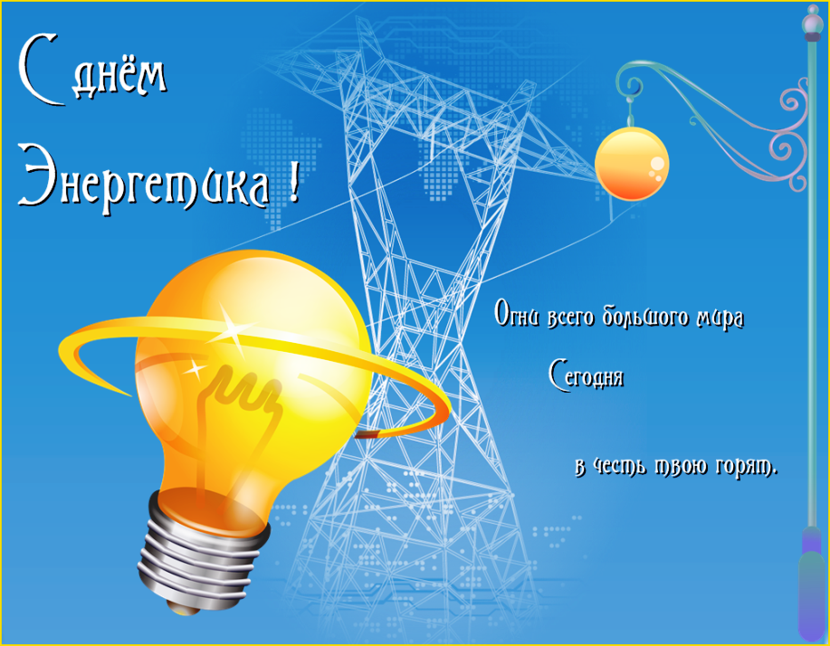 Дорогие наши энергетики! Ваша задача — давать миру тепло и уют, дарить людям свет, обеспечивать комфорт, что в конечном итоге означает «давать жизнь»! Желаем вам крепкого здоровья на долгие счастливые годы, напряженных, но очень успешных трудовых будней, веселого разнообразия в праздники и полноценного отдыха! Пусть никогда не иссякнет энергия ваших душ и сердец, высоко ценится ваш труд! В ваших семьях пусть цветут любовь и уважение, всегда будет благополучие и мирное небо над вашими крышами!