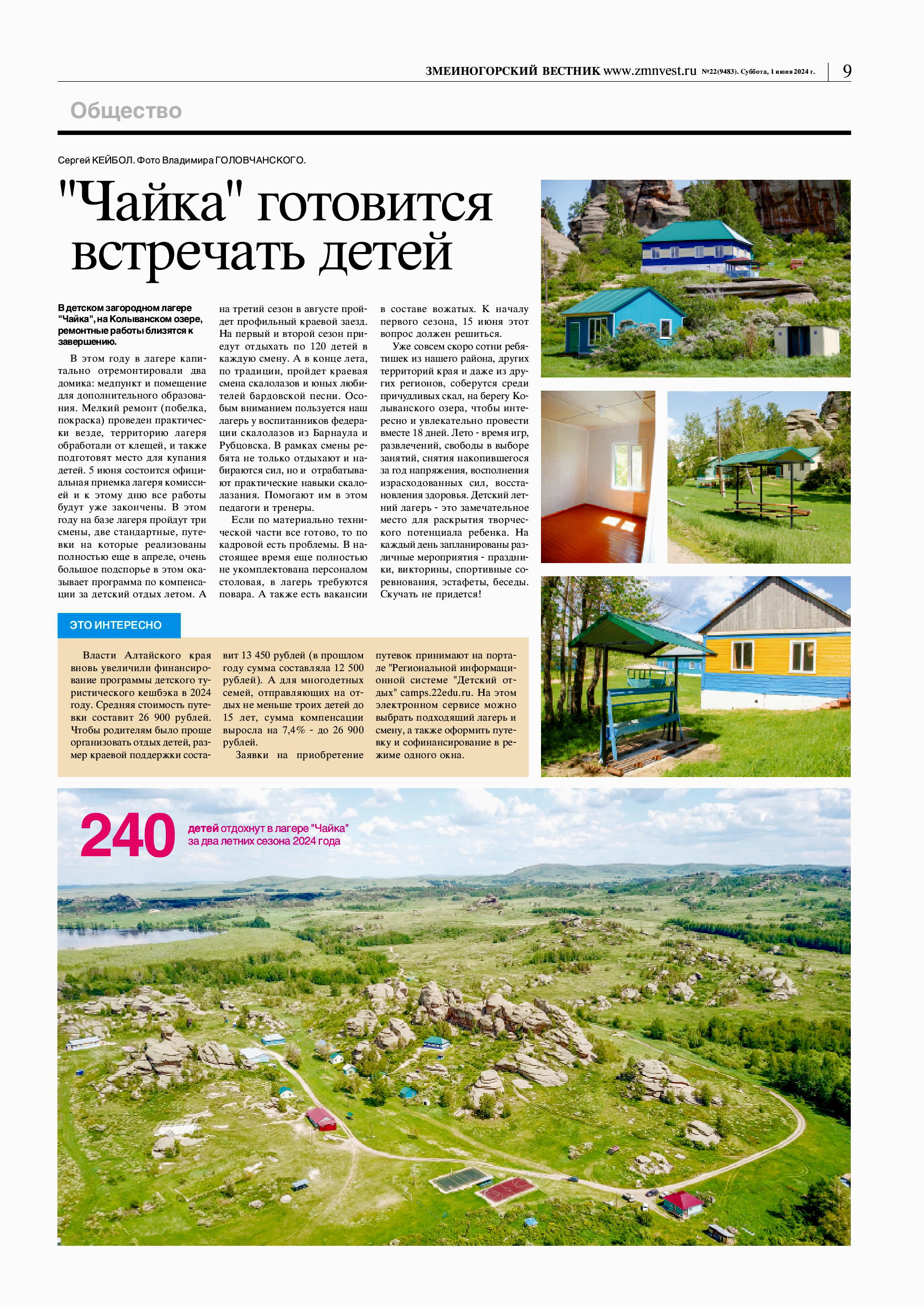 Здесь вы можете прочитать много интересного!Материал о том, как лагерь "Чайка" готовится встретить первых отдыхающих. Что нового будет в летнем отдыхе детей -2024. Подробная информация и все победители соревнований мотоциклистов по бездорожью (эндуро). Целая страница с подборкой материалов от юнкоров (проба пера - читайте и радуйтесь за своих детей!). А еще исторические материалы, истории жизни земляков и многое другое.