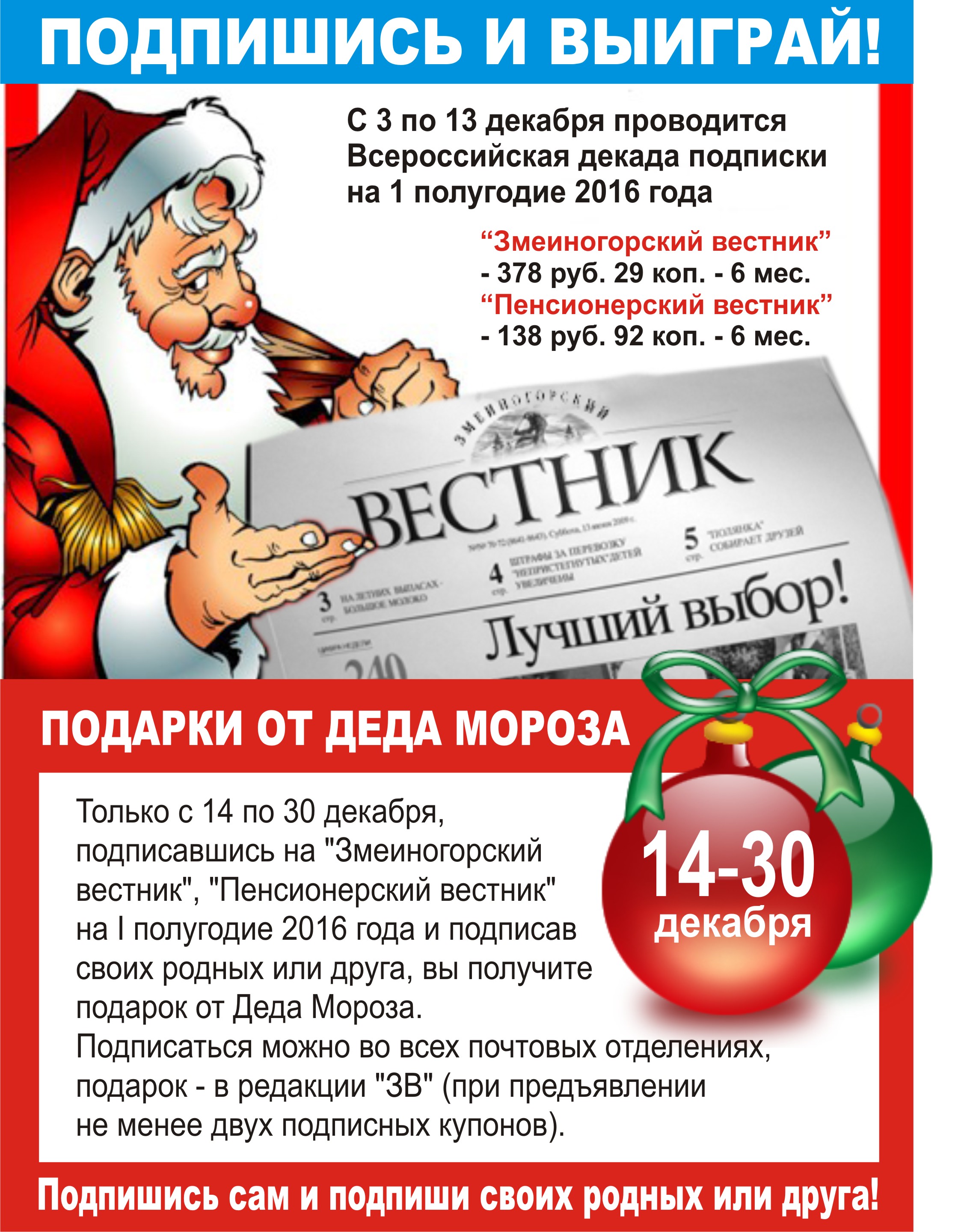 Поэтому совместно с отделениями Почты России редакция газеты «Змеиногорский вестник» подготовила для своих подписчиков интересные предложения. Смотрите рекламу, читайте и выбирайте – что вам удобнее!Напоминаем, что каждый из вас, подписавшись на наши издания, становится автором летописи районной и краевой жизни. Оставайтесь с нами в 2016 году – и вы всегда будите в курсе самых актуальных событий, сможете принимать участие в общественных расследованиях, комментировать и обсуждать действия всех структур власти, получать максимум полезной информации, что особенно важно в наше непростое время!