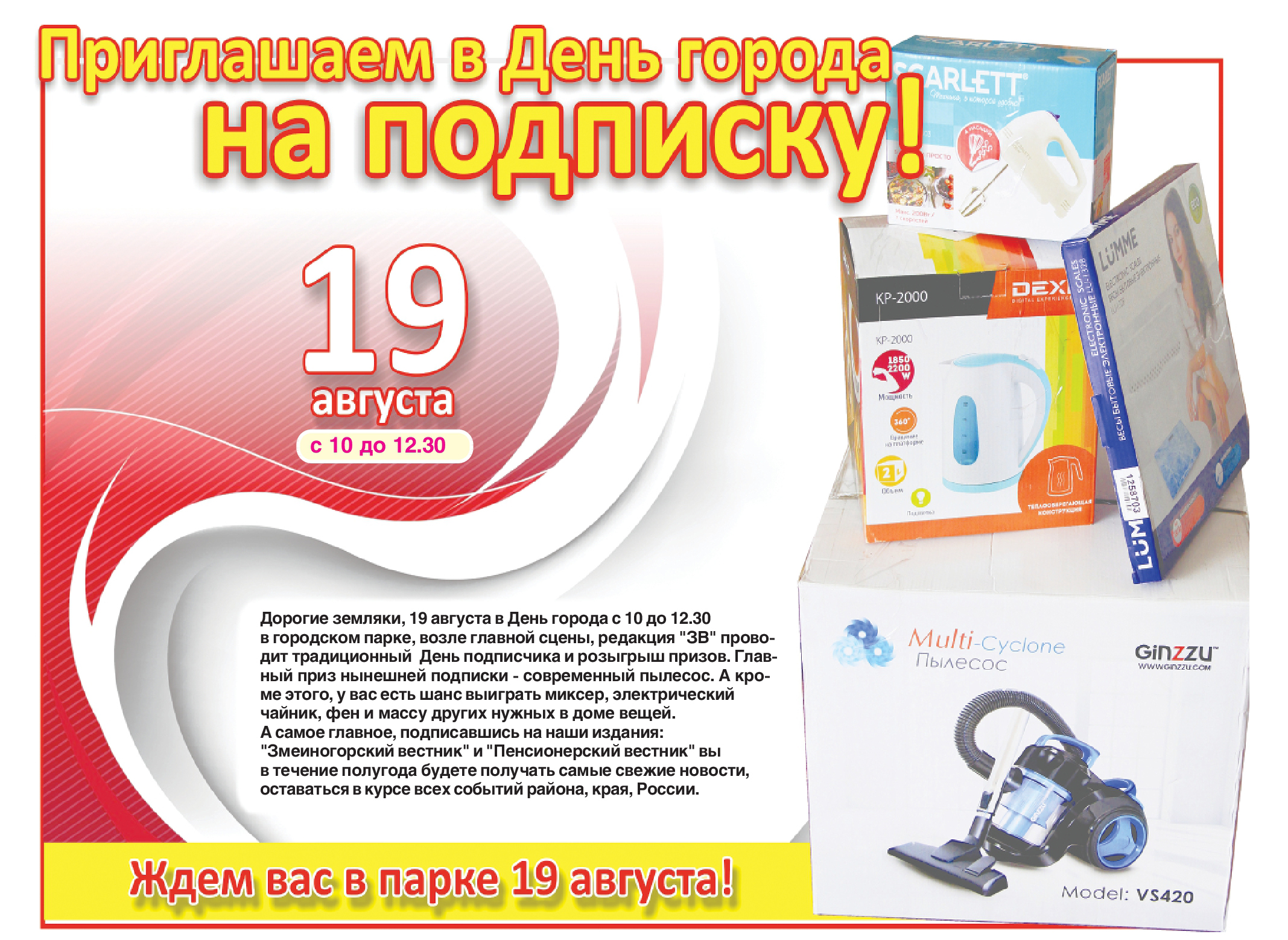 19 августа в день города, в городском парке, около главной сцены редакция "ЗВ" проводит подписку на газеты "Змеиногорский вестник", "Пенсионерский вестник" на 1 полугодие 2019 года и розыгрыш призов. Главный приз - современный пылесос.Приходите, подписывайтесь, выигрывайте!