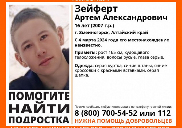 В Змеиногорске 4 марта пропал Зейферт Артем Александрович, сообщает поисковый отряд "ЛизаАлерт". Возбуждено уголовное дело об убийстве, сообщает СК по краю.