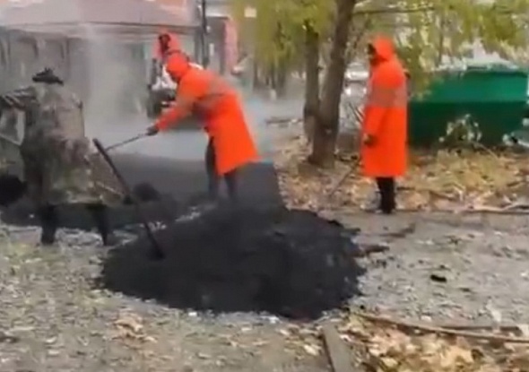 Народный фронт показал видео, на котором дорожники укладывают асфальт в ливень на листья и мусор.
