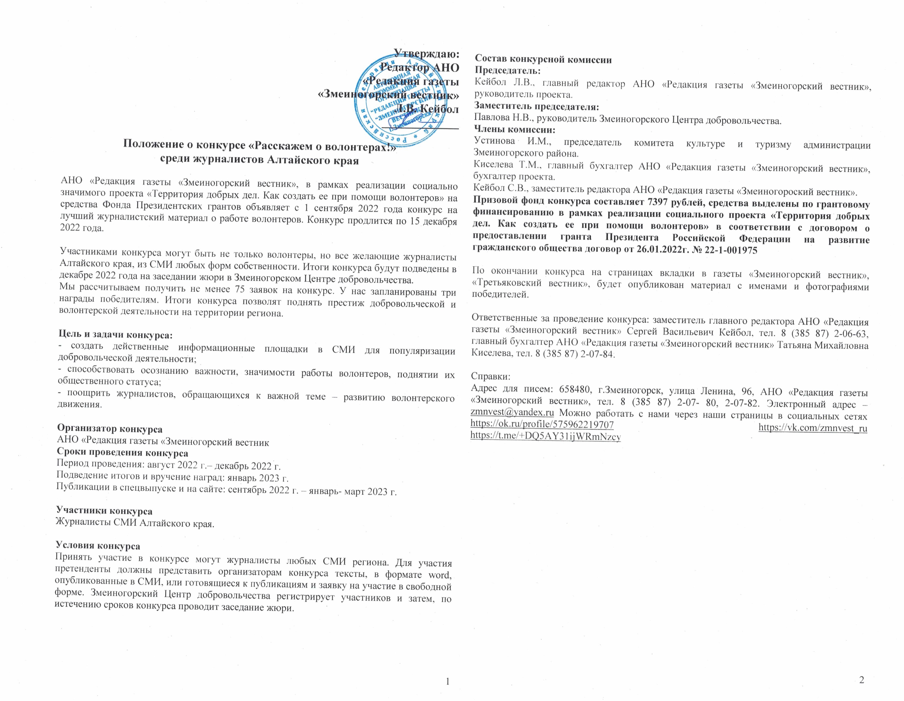 АНО "Редакция газеты "Змеиногорский вестник" объявляет о начале конкурса для журналистов Алтайского края "Расскажем о волонтерах!".Этот конкурс мы организуем в рамках социально значимого проекта "Территория добрых дел. Как создать ее при помощи волонтеров", который АНО реализует на средства Фонда Президентских грантов.