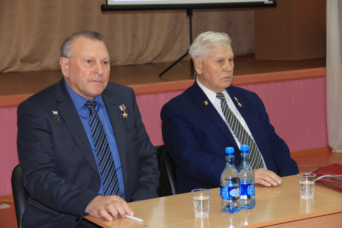 24 октября в Змеиногорской школе с углубленным изучением отдельных предметов прошла встреча школьников и сотрудников Змеиногорской пограничной комендатуры с двумя Героями России - Владимиром Ильичом Шарпатовым и Валерием Серпионовичем Поташовым. Встреча проходила в рамках всероссийской акции – «Вахта Героев Отечества» приуроченной к 75-летию Великой Победы.