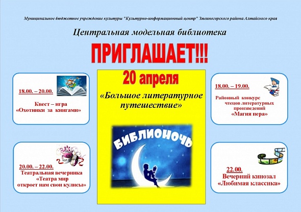 Пятый раз библиотеки Змеиногорского района принимают участие во Всероссийской акции «Библионочь». В акции 10 библиотек района работали в вечернее время. Участниками «Библионочи» стали 275 человек. В рамках акции проведены мероприятия разных форм литературные, тематические вечера, часы информации игровые, интеллектуальные и другие увлекательные программы для посетителей разного возраста.
