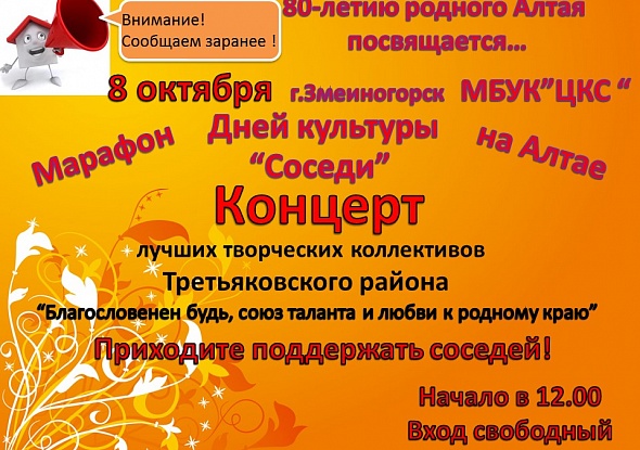 С целью укрепления и развития связей между территориями Алтайского края, удовлетворения потребностей населения региона в качественном досуге впервые в Алтайском крае с марта по декабрь текущего года проводится Марафон Дней культуры муниципальных образований Алтайского края - «Соседи», посвященный 80-летию Алтайского края. Марафон Дней культуры – это серия официальных творческих мероприятий, которые проводятся в рамках выезда в иные, преимущественно – соседние, районы.