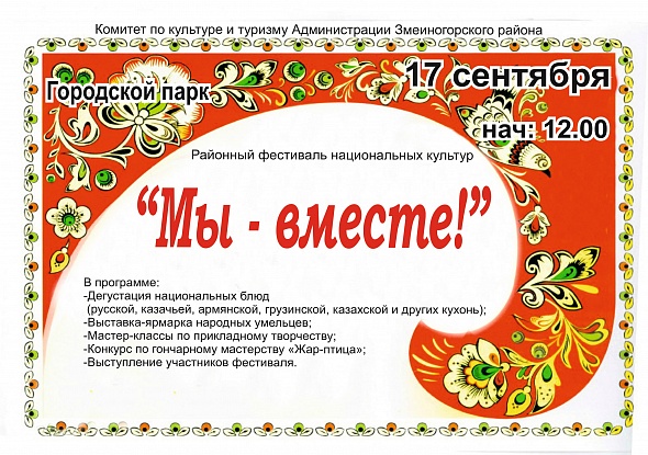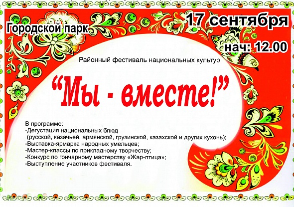 17 сентября в городском парке в 12 часов состоится районный фестиваль национальных культур.