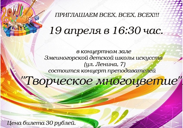 Сегодня в 16:30 в Змеиногорской детской школе искусств пройдет концерт преподавателей - "Творческое многоцветие".