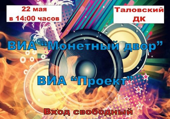 Таловский Дом культуры приглашает Вас на концертную программу ВИА "Монетный двор" и ВИА "Проект", которая состоится 22 мая в 14:00 часов в Таловском Доме культуры.